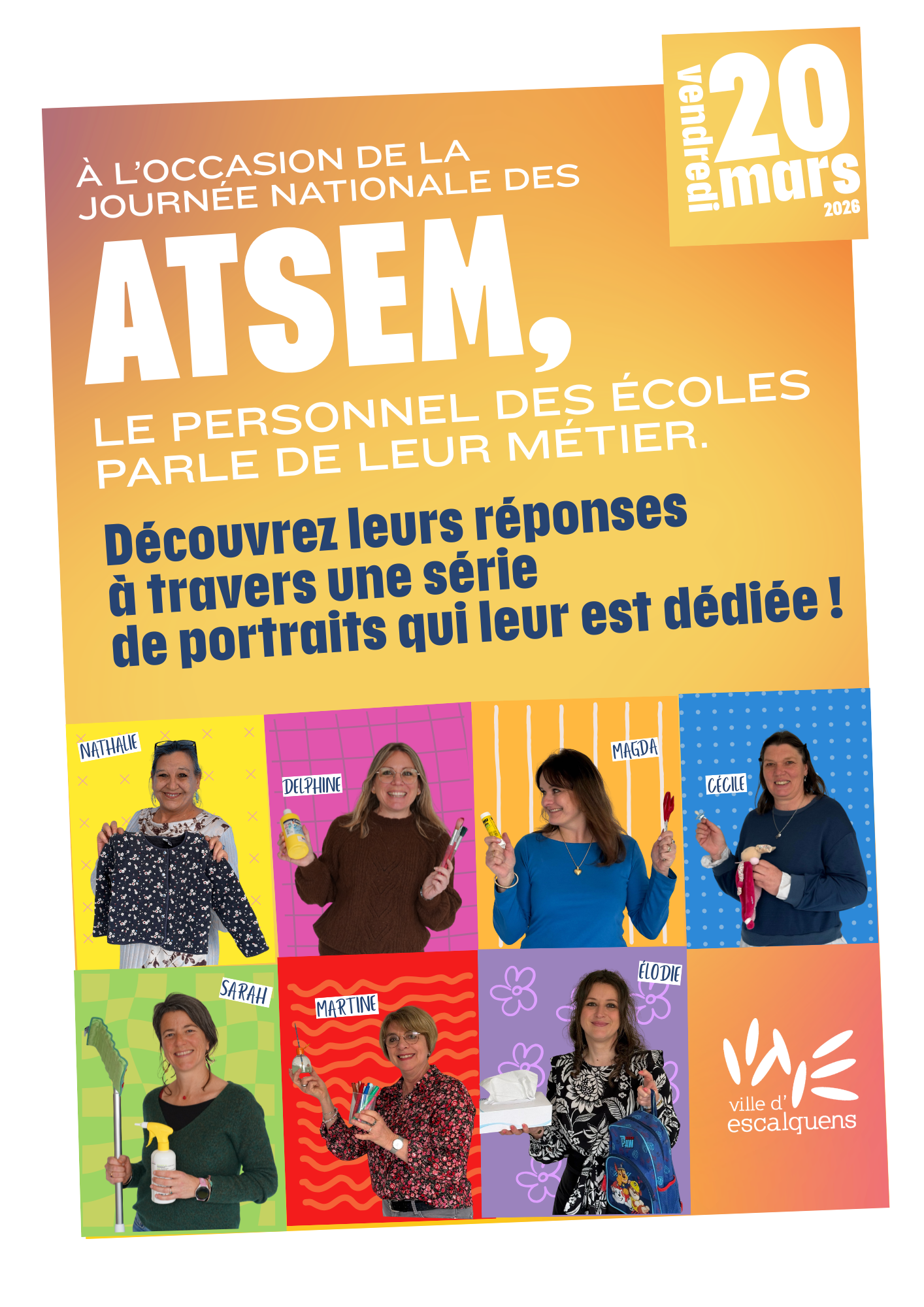 Pour saluer leur engagement quotidien, la Ville d’Escalquens déploie cette année une communication spéciale à travers une série de portraits photographiques des ATSEM de la commune, permettant de mettre en lumière leur métier et leur passion pour l’accompagnement des